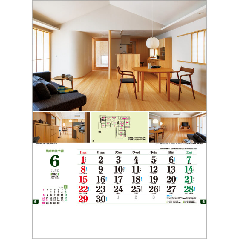 現代住宅の内装写真と間取り図面入りの壁掛けカレンダーです。六曜だけではなく建築吉日入りの専門的なカレンダーなので、建築関係の企業様やインテリアや雑貨を扱う店舗様などにピッタリです。写真部分が大きめに設定されているので、カレンダー部分はシンプル。メモ書きスペースが無い分、日付がしっかり分かるように大きく書かれてあります。表紙及びカレンダー下にはオリジナルの名入れ印刷が可能です。