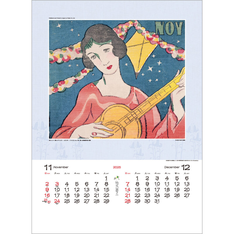 大正ロマンを代表するアーティスト、竹久夢二の美人画を集めた壁掛けカレンダー。サイズは、608×425mmのA2相当の大きさです。夢二郷土美術館所蔵・監修で、表紙+2ヶ月おきのカレンダー6枚の計7枚綴り。原画の出典は屏風絵や出版物の表紙などさまざまですが、どの作品も夢二らしい色彩と線で、洗練された雰囲気が漂います。ポスター的に飾ると、お部屋の素敵なアクセントになってくれるでしょう。カレンダー部分は、白地に黒と赤文字のみのシンプルなデザイン。六曜も記載されています。名入れ印刷は、カレンダー下部に、60×380mmまでのサイズで印刷可能。オリジナルカレンダーとして、ご利用ください。