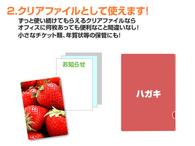 メール便とクリアファイルの2WAY仕様が新しい「ファイルDEメールハガキサイズ」は、フルカラー印刷全面対応なのでインパクトのある販促品です。上部に付いている両面テープで封をすればメール便の完成!メール便を受け取った方は、余分な所を切り取ることによりクリアファイルとして使用できます。ポストカードと同じサイズなので、受け取った際にバッグに入れやすいことも魅力です。