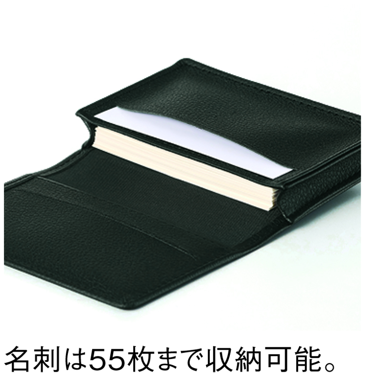 リサイクルレザーカードケース(ブラック)は、リサイクルレザーを使用したスタイリッシュなデザインのカードケースです。落ち着いたカラーが上品な印象を与え、名刺を最大55枚まで収納できます。