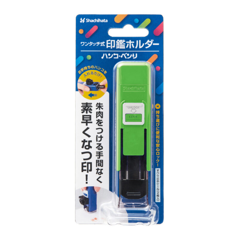 ハンコ・ベンリN イエローグリーンは、手持ちの印鑑を装着すればワンタッチで捺印できる印鑑ホルダーです。セットするだけで自動的に朱肉がつく設計、片手でサッと押すことが可能です。速乾性と耐久性に優れたインキを使用しています。