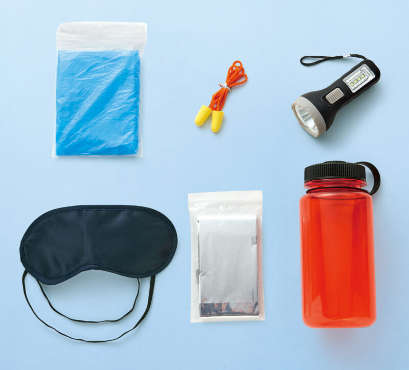 1.ウォーターボトル/AS樹脂・ポリプロピレン 2.レインポンチョ/ポリエチレン 3.アルミブランケット/アルミ蒸着PET 4.2WAYライト/ABS樹脂・ナイロン・アルミニウム 5.アイマスク/ポリエステル・スポンジ・不織布 6.耳栓/ニトリルゴム・ポリエステル