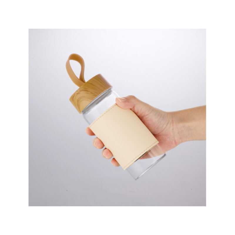 ウッドスタイル耐熱ガラスボトル(カバー付き)(グレージュ)は、熱い飲み物を入れても割れない耐熱ガラスでできたボトルです。木目調デザインの蓋がついており、おしゃれな雰囲気に仕上がっています。蓋部分には持ち運びに便利なストラップが付いています!