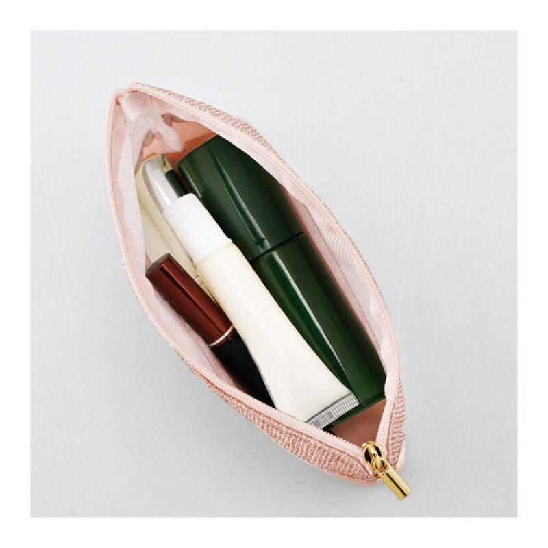 シャイニーナ・ラメスリムポーチ ピンクゴールドは、化粧ポーチにピッタリなサイズ感です。約120×180×20mmで、マチが2センチのスリムなデザインなので、小さめのバッグにも収納しやすいです。