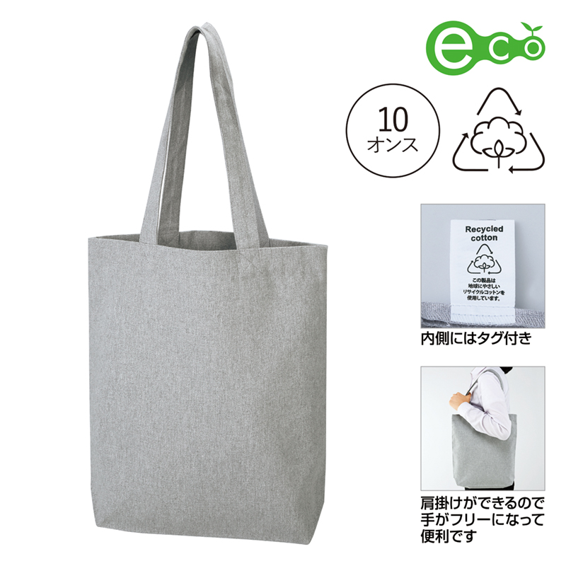 スフィア・リサイクルコットンA4トートバッグ(マチ付)-グレーは、環境に配慮したリサイクルコットン製のA4サイズトートバッグです。内側には「リサイクルコットン使用」のタグが付いており、約80mmのマチもあります。