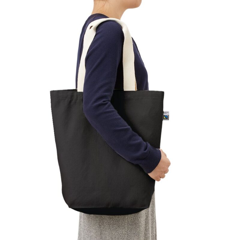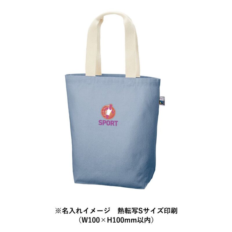 フェアトレードコットントート M スモークブルーは、国際フェアトレード基準を満たした認証付きのトートバッグです。約130mmのマチが付いた舟底型で、肩掛けしやすい持ち手も付いています。