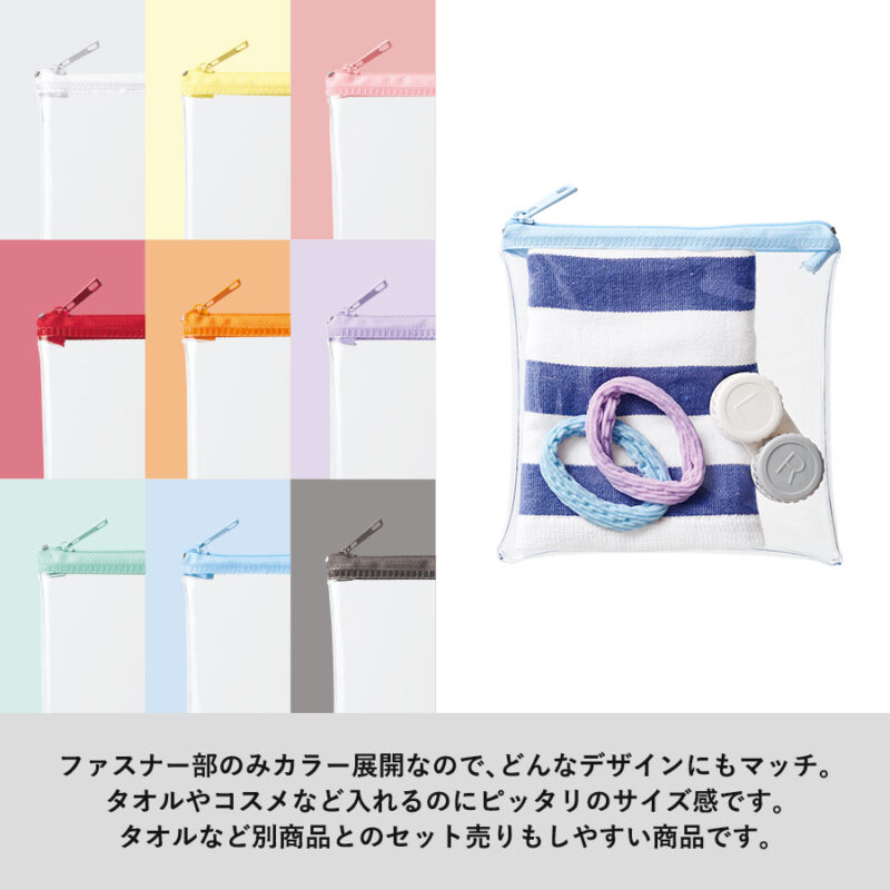 カラーファスナークリアポーチ(S) ホワイトは、ファスナー部分のカラーが異なるデザインが特徴のクリアポーチです。縦130mm×横140mmのサイズで、小物入れとしてぴったり。