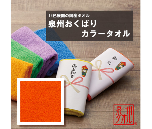 泉州おくばりカラータオル オレンジは、コットン生地を使用した吸水性の高いタオルです。安心・安全の国産製で、肌触り良く清潔感があります。大きさは一般的なフェイスタオルサイズ。名入れ部分は平織りになっています。