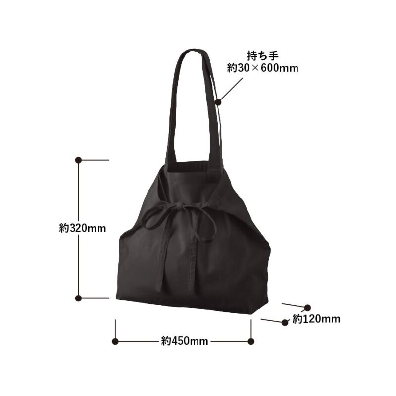 オーガニック厚手コットン紐リボントート ブラックは、オーガニックコットン製の紐付きトートバッグです。紐の結び方を変えることで、台形型バッグ、リボンバッグ、ショルダーバッグと3種類の使い方ができます。