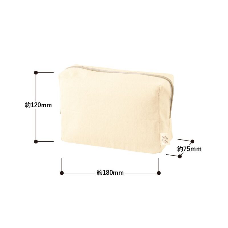 オーガニックコットンキャンバスファスナーポーチ ナチュラルは、オーガニックコットン製でスクエア型のポーチです。ファスナー付で約75mmのマチもあるため、いろいろな小物を入れて持ち運べます。