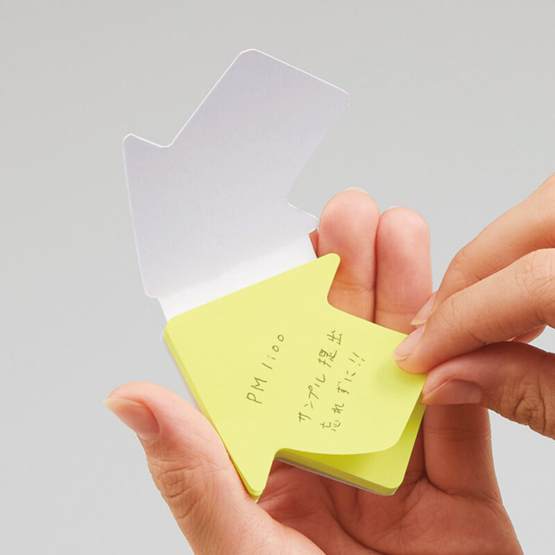 カスタムデザイン付箋は、矢印の形をした付箋です。インパクトのあるデザインで、メモを目立たせることができます。表紙はカスタム可能、お好みのデザインを全面フルカラーで印刷できます。付箋は黄・オレンジ・緑の3色綴りです。