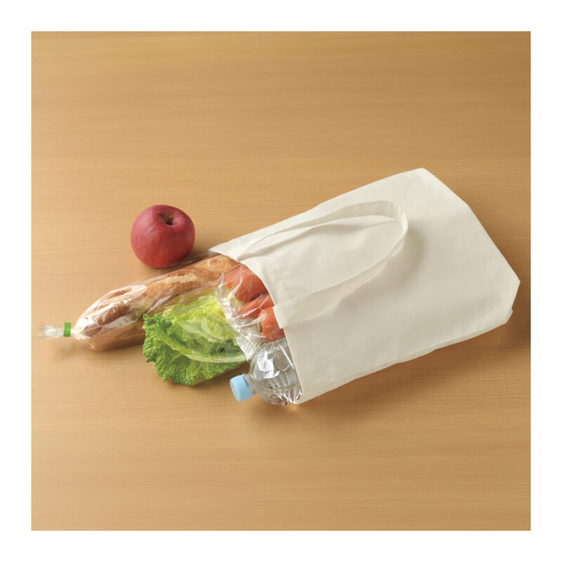 買い物に便利なコットン製バッグです。生地は5ozの適度な厚みがあり、底部分には90mmのマチがあるため、ペットボトルや厚みのあるアイテムもしっかり収納可能。